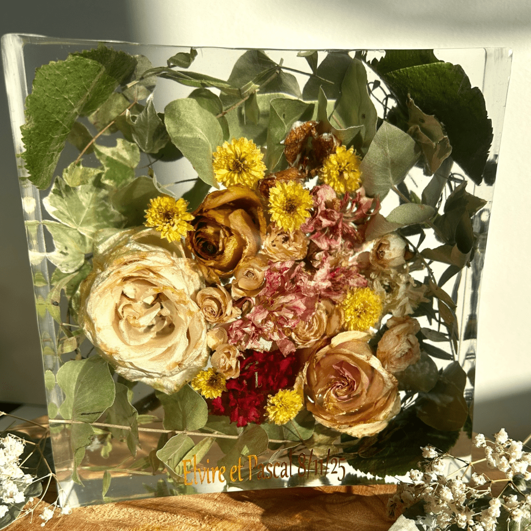 Vous souhaitez conserver votre bouquet ou des fleurs qui vous tiennent à cœur ? Offrez-leur une seconde vie grâce à une création unique et personnalisée en résine.